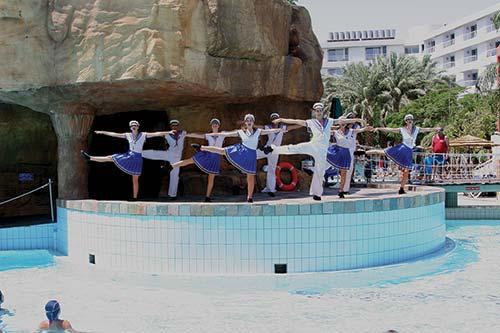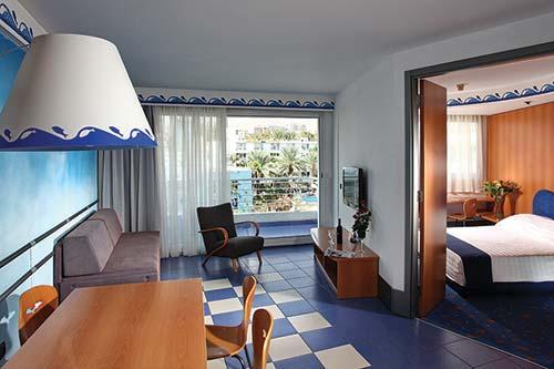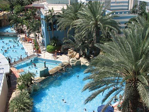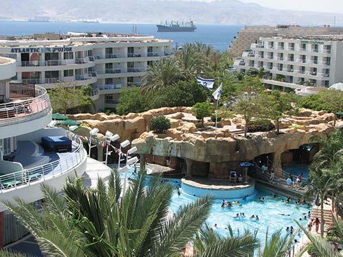 Eilat Club Hotel has over 700 suites and is situated in the center of Eilat, a short walk from the commercial and business centers. The lagoon-style swimming pools and waterfalls are surrounded by man-made rock formations and exotic plants. Each suite includes a kitchenette and a wide balcony. On-site facilities include restaurants, entertainment centers, a banquet hall, and playgrounds. The complex is set a few steps away from the Red Sea.