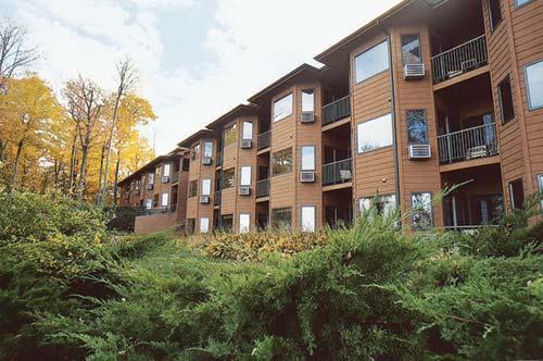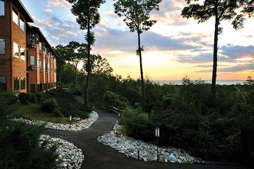 Located on a wooded bluff overlooking the waters of Green Bay, Landmark Resort in Wisconsin's Door County is open year-round and framed by natural beauty. One-, two-, and three-bedroom suites feature full kitchens, living rooms, and private decks. The resort offers one indoor (open 24 hours a day, seven days a week) and three outdoor swimming pools, whirlpools, steam rooms, and tennis courts, along with a fitness center, restaurant, lounge, and Wi-Fi service. Guests can also go sailing, fishing, biking, golfing, and cross-country skiing nearby.
