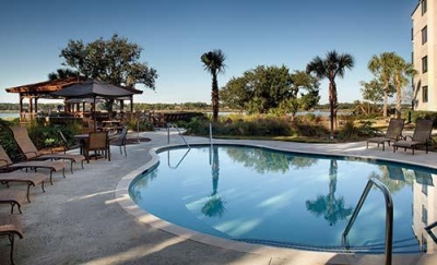Located on the tidal marsh of Broad Creek near the mouth of Shelter Cove Harbour, Marriott's Sunset Pointe offers 980-square-foot (91 square meters), two-bedroom, two-bath villas, each with a private balcony, fully equipped kitchen, utility room with a washer and dryer, and Wi-Fi. Recreational amenities include two outdoor swimming pools (one heated), tennis courts, a fitness center, supervised activity program, and barbecue areas. A Marketplace Express offers snacks and sundries. Beach access is 2 miles (3 kilometers) away. The Shelter Cove Marina is just a four-minute walk away.