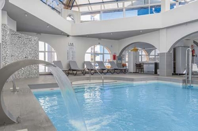 A family resort styled in traditional Moorish architecture, Sahara Sunset is centered around a beautifully landscaped pool, just 328 feet (100 meters) from the beach. Nearby are Torrequebrada Golf Club, tennis courts, casino, and the Benalmádena Marina, where guests can enjoy a host of amenities and attractions including restaurants, bars, lively nightlife, and shopping centers. On-site are an outdoor pool, cafeteria/restaurant, minimarket, and a clubhouse with indoor pool, gym, two whirlpools, spa area, massage room, and beauty salon with hairdressers. The fully appointed apartments have telephones, air conditioning, and Wi-Fi.